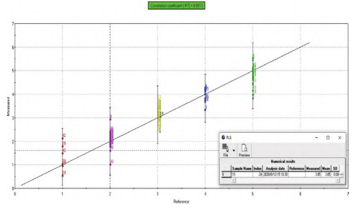 PLS模型是一種偏最小二乘回歸分析模型,使用已知感官得分的參考樣品來設置標準曲線,并根據變量的不同權重,計算各變量的回歸系數,建立回歸方程,模型相關系數>0.8為合格。常用來預測感官得分和評級。將大米品質的不同級別分別對應1-5分,并將對應打分賦予各個樣品,而后建立PLS模型(如圖5所示)。由圖8得出,相關系數0.9013>0.8,模型合格。將樣品19的一個平行樣在模型中投射,可得模型計算得分為3.05分,屬于優質三級大米,與人工評級相符,后續可嘗試用此模型對新批次樣品進行等級評價。