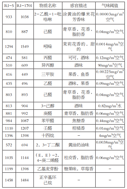 化合物的保留指數是指在某種固定相上使用正構烷烴作為標準來衡量化合物在色譜柱上保留程度的量化值。同一種色譜柱的某一化合物的保留指數是恒定的。化合物的保留指數可經由正構烷烴的保留時間和化合物的保留時間計算而得到,利用兩根色譜柱不同的保留指數可達到在無標準物質的情況下定性化合物的效果。用AroChembase數據庫對樣品中的揮發性化合物(差異色譜峰)進行定性,可能含有的化合物見表2所示。閾值的大小代表了物質氣味的強弱,相同含量的兩種物質,閾值越低則氣味越強。