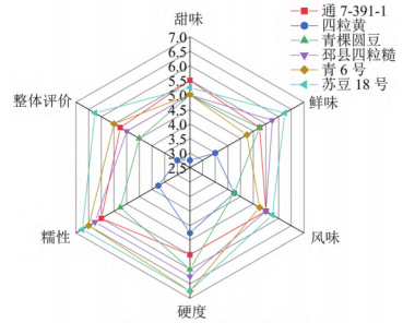 菜用大豆感官評價結果如圖1所示。通7-391-1甜味值最高,為5.50,甜味明顯。蘇豆18號在鮮味( 6.25)、香味( 5.75)、糯性( 6.75)、硬( 6.75)方面得分最高,而且綜合平均得分最高,為6.25,說明從整體來看,蘇豆18號具有菜用大豆固有的香氣,鮮味,口感軟糯滋味相對較好。四粒黃得分最低,為3.67,且與其他樣品的得分離散程度最大,說明口感滋味不符合大眾喜歡。