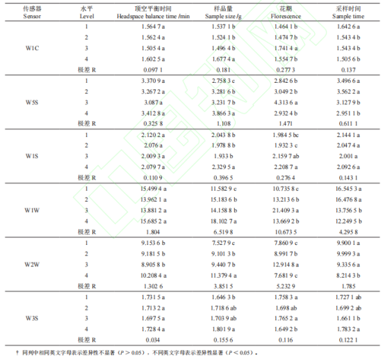 不同因素對電子鼻各傳感器(W1C、W5S、W1S、W1W、W2W和W3S傳感器)的影響見表1。從表3可知,不同因素對電子鼻測定櫻花花香的影響差異顯著,對電子鼻傳感器的響應影響從大到小依次是不同花期、樣量、采樣時間,在不同頂空平衡時間因素下電子鼻各傳感器響應極差均最小。從各因素的不同水平看,在不同頂空平衡時間因素中,水平1、4高于水平2、3;樣品量中水平4的電子鼻各傳感器響應值顯著高于其他水平,水平1、2、3差異不顯著;在不同花期因素下,除了W1S傳感器之外,其余傳感器在水平3時的響應值高于其他水平,且與其他水平差異極顯著;采樣時間中各水平差異不顯著。說明電子鼻對盛開時期的櫻花花朵且樣品量為4g時響應較大。