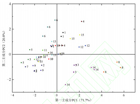 圖2是基于山櫻花香氣的電子鼻數據(W1C、W5S、W1S、W1W、W2W和W3S傳感器響應值G/G0)構建的主成分分析圖(PCA)。第一主成分PC1的貢獻率為71.7%,第二主成分PC2的貢獻率為20.8%,總貢獻率達到92.5%,說明第一、第二主成分能很好地反映供試樣品的整體信息。從圖2可以看出,3、6、8和14號處理組合與其他處理組合的樣本點沒有重疊,由此可以區分出3、6、8和14號處理。結合圖1可知8號處理各傳感器的響應值顯著高于其他處理,且與其他處理差異極顯著。因此,8號處理,即A2B4C3D2處理組合(在12:00采集盛開時期的櫻花花朵4g,在頂空平衡30min后進行電子鼻測定)的表現最優,為電子鼻快速測定櫻花香氣的最優組合。