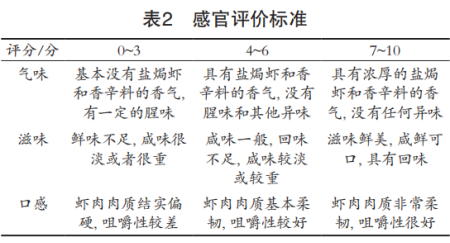 感官評價小組(8人)從鹽焗蝦的口感、滋味和氣味3個方面評定其品質,每項滿分為10分,感官評價總分為30分,評分標準見表1。