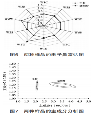 生蝦和鹽焗蝦的電子舌雷達圖如圖1所示,兩種樣品的味道特征不同。在酸味方面,生蝦遠高于鹽焗蝦;在苦味、澀味和澀味回味方面,生蝦略高于鹽焗蝦;而在鮮味和咸味方面,鹽焗蝦明顯超出了生蝦。咸味是由于鹽的存在,而鮮味則可能是因為高溫的處理使得蛋白質與多肽的分解,從而積累鮮味氨基酸如谷氨酸、賴氨酸和甜味的氨基酸如絲氨酸、蘇氨酸、甘氨酸、丙氨酸和賴氨酸,因此這兩方面的味道非常突出,但也缺失了一些豐富性。