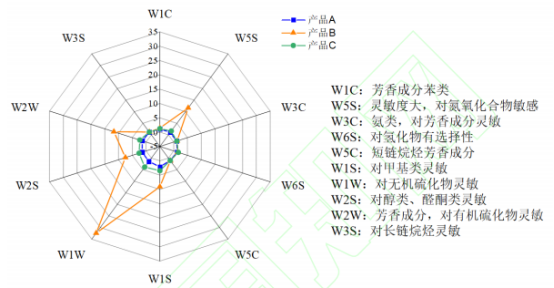 為驗證不同霉莧菜梗風味差異,使用電子鼻的傳感器確定霉莧菜梗的風味成分分類。響應強度雷達圖(圖2)所示,產品A和C的傳感器響應強度較小,并且雷達圖線幾乎重合,但產品C的W1W傳感器響應強度略高于產品A。產品B的W1W傳感器響應強度達到最高,W2W、W5S、W1S和W2S傳感器響應強度相對較高,顯示無機硫化物、芳香成分、氮氧化合物、甲基類、醇類和醛酮類化合物的風味強度,產品B>產品C>產品A。這些結果說明,電子鼻可以有效地區分不同霉莧菜梗間的氣味物質差別。