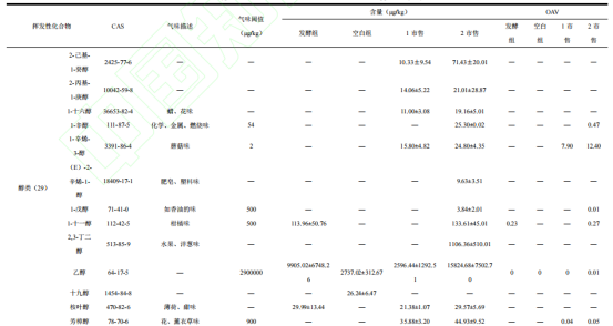 空白組中十二醛(脂肪味)、十四烷醛(花、蠟味)、辛醛(脂肪、肥皂味)、壬醛(脂肪味)OAV>1,對空白組的風味起到主要作用。桉葉醇(薄荷、甜味)和1-十一烷醇(柑橘味,0.1<OAV<1)是發酵組中特有的風味物質,在發酵手撕牛肉干形成特殊風味中起到重要的作用。9-十六烯酸乙酯,為發酵手撕牛肉干提供了更多香味。