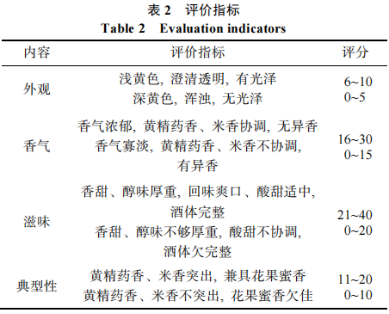 感官評價指標參照G/BT1538—2006《葡萄酒、果酒通用分析方法》及DB45/T1835—2018《地理標志產品黃姚黃精酒》評定方法評價,其中外觀(10分)、香氣(30分)、滋味(40分)、典型性(20分),由15人(年齡20-35周歲,男7名,女8名)組成評價小組對酒樣進行感官評定,取平均值。