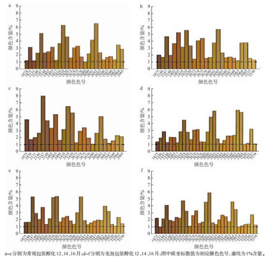 對常規(guī)和充氮包裝下醇化片煙樣品進行電子眼分析,對相近顏色歸一化處理,形成顏色分布結(jié)果(圖1)。從圖1可以看出,6個不同醇化片煙的顏色主要有48種,分布于黃色到褐色范圍,且存在差異。其中,常規(guī)包裝醇化煙葉的黃褐色和橄欖褐色分布較高,而充氮包裝醇化煙葉的深黃色和深橘黃色分布比例較高。