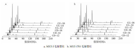 對充氮和常規(guī)包裝的醇化片煙樣品進行快速氣相電子鼻分析,得到2根不同極性色譜柱對應(yīng)的揮發(fā)性成分指紋圖譜,結(jié)果如圖3所示。可以看出,不同包裝片煙的色譜峰在52~68個之間,其峰面積也不相同,說明樣品揮發(fā)性成分種類和含量存在一定差異。且不同醇化時間下,同一包裝片煙的揮發(fā)性成分種類和含量也有明顯差別。