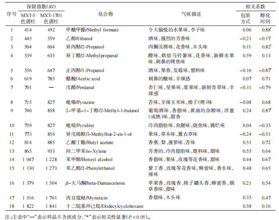 在PCA分析的基礎(chǔ)上,將各組分的保留時間轉(zhuǎn)化為保留指數(shù),再通過AroChembase數(shù)據(jù)庫(包括15萬種化合物的保留指數(shù)值)進行定性,篩選出了18種可能的差異揮發(fā)性成分,并進行感官描述。醇化片煙揮發(fā)性差異成分、感官描述信息及相關(guān)系數(shù)見表1。可以看出,不同包裝方式和醇化時間片煙中的主要揮發(fā)性差異化合物包括醇類(7種)、醛類(2種)、酯類(2種)、雜環(huán)化合物(2種)和其他化合物(5種)。結(jié)合圖3的峰面積可知,各處理醇化片煙中含量較高的化合物均為醋酸、異丙醇、甲酸甲酯、β-大馬酮和戊醛。