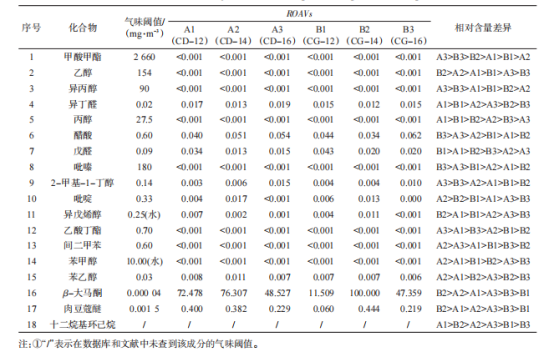 為確定差異揮發(fā)性化合物對醇化片煙氣味的貢獻程度,篩選出的主要差異化合物進行ROAV分析,采用面積歸一化法計算化合物的相對含量,采用AroChembase數(shù)據(jù)庫和文獻中檢索到的化合物氣味閾值為嗅覺閾值。18種主要差異化合物中,β-大馬酮的相對含量較高,且嗅覺閾值較低,因此定義CG-14中的β-大馬酮(相對含量最高)的ROAV值為100。
