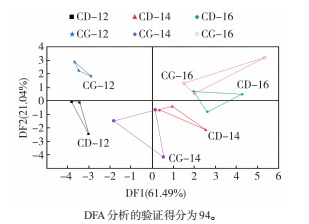 因此,將不同包裝方式的片煙樣品的電子眼和電子鼻數(shù)據(jù)整合,將數(shù)據(jù)歸一化處理后提取特征數(shù)據(jù),進行DFA判別模型分析,以考察電子眼和電子鼻聯(lián)合分析對醇化煙葉的鑒別效果,結(jié)果如圖7所示。可知,DF1和DF2之和為82.53%,驗證得分為94,說明顏色和氣味分析擬合后也能較好地區(qū)分各個樣品。樣品間距離越遠,整體的感官差別越大。從圖7可知,不同包裝煙葉分別分布在圖中不同區(qū)域。說明不同包裝方式和醇化時間造成了醇化片煙整體感官的差異;且醇化時間越長差異越大,不同醇化時間片煙樣品的相對距離越遠。