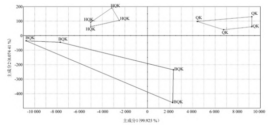 圖3  3種色澤氣流膨化青稞米的電子舌PCA圖